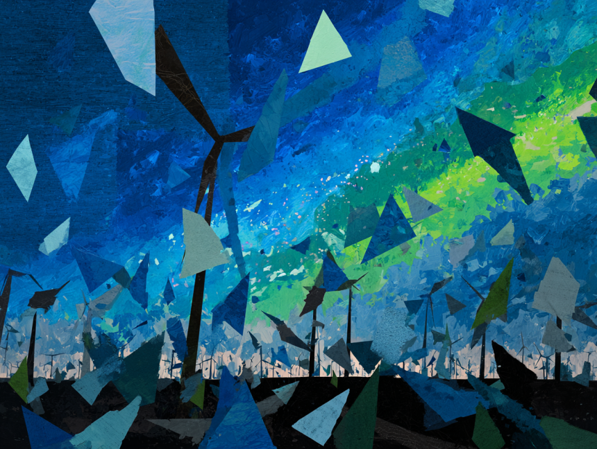 A speculative landscape where plant forms and energy structures merge, suggesting climate recovery must be designed, not assumed.